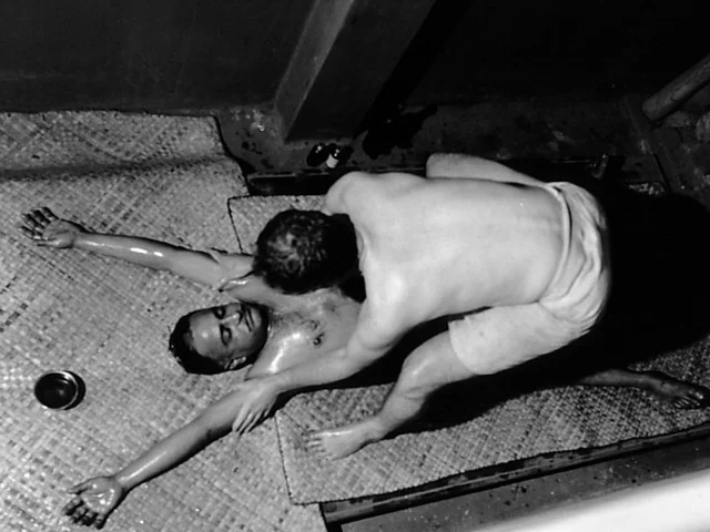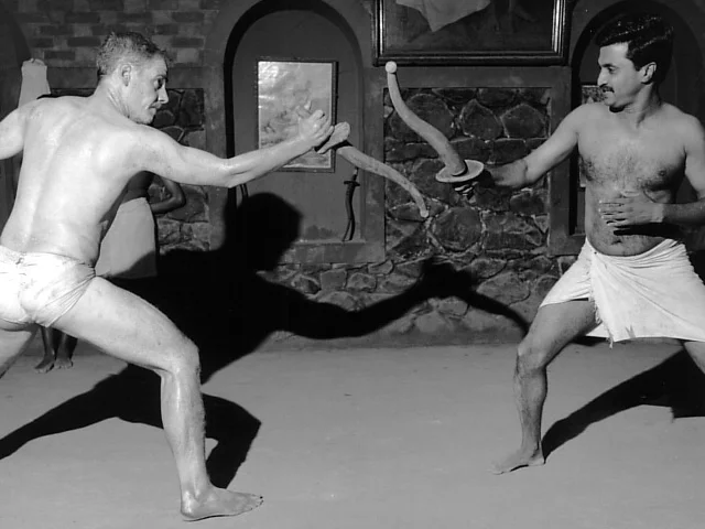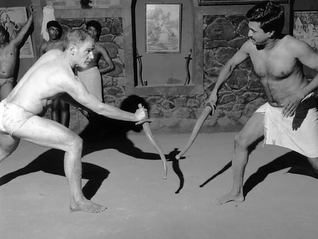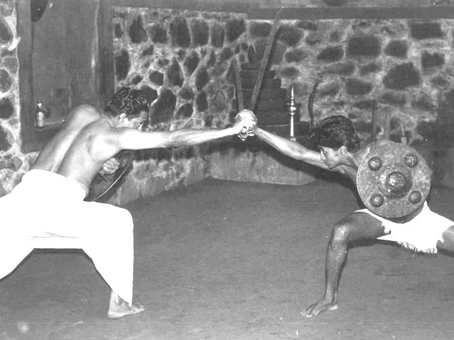 Left: Phillip Zarrilli's early training (1977) in sword and shield with Gurukkal Govindankutty Nayar.