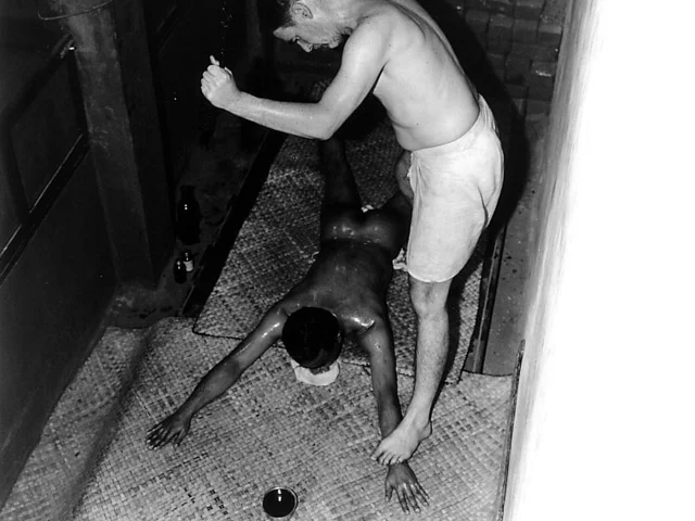 Phillip Zarrilli giving the traditional full body massage at the CVN Kalari, Thiruvananthapuram.